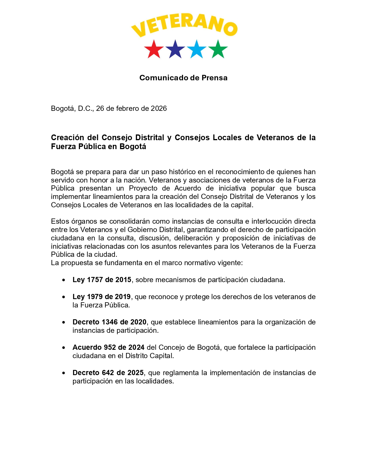 En un momento clave para la participación ciudadana en Colombia, Bogotá se posiciona como pionera en el homenaje a quienes han defendido la patria. Hoy, 26 de febrero de 2026, veteranos de la Fuerza Pública y sus asociaciones han lanzado un Proyecto de Acuerdo de iniciativa popular para establecer el Consejo Distrital de Veteranos y los Consejos Locales de Veteranos en cada una de las localidades de la capital. Esta propuesta busca crear espacios formales donde estos héroes puedan influir directamente en políticas que les conciernen, fortaleciendo así la democracia local y reconociendo su invaluable servicio.